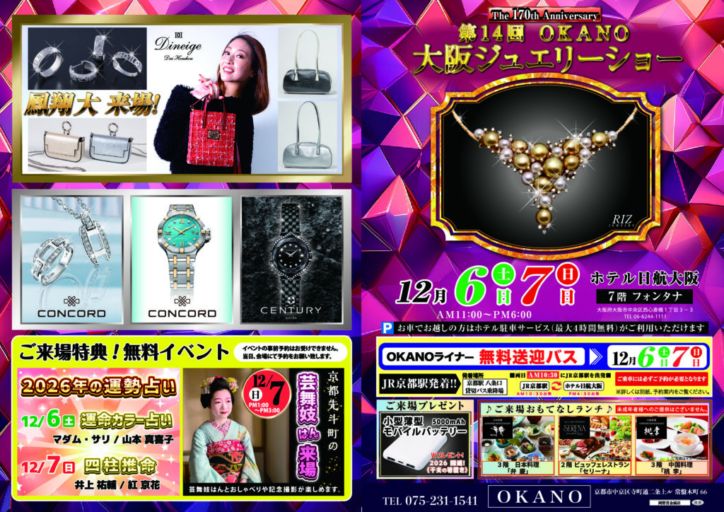 ご招待パンフレットをご持参くださいませ。 ご同伴者様は受付にてお渡しいたします。 日時 2025年12月6日(土)7日(日) AM11:00~PM6:00 場所 ホテル日航大阪 7F フォンタナ 大阪市中央区西心斎橋1丁目3-3 ℡ 06-6244-1111 記事一覧